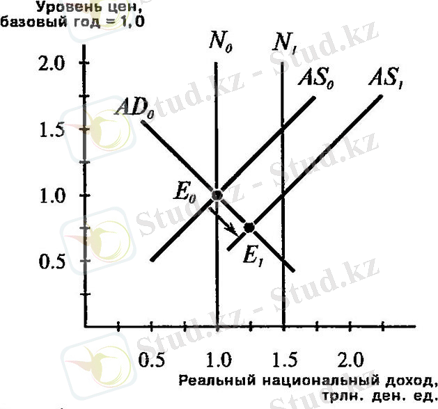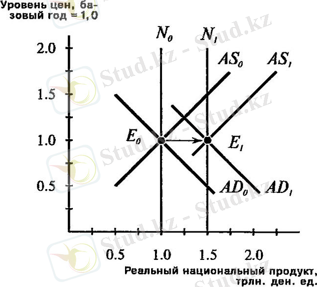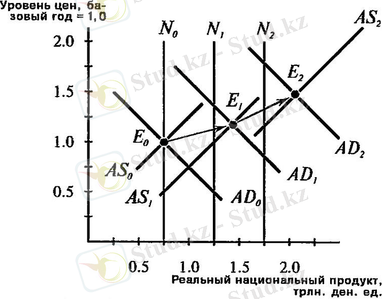 Ұлттық өнімнің табиғи деңгейі өсті делік. Ұзақ мерзімді жиынтық ұсыныс қисығы бастапқыда N0 позициясынан N1 позициясына ауысады. Қысқа мерзімді жиынтық ұсыныс қисығы AS0-ден AS1-ге дейінгі ұзақ қисық қисықпен бір уақытта жылжиды. Экономикалық құлдырауға жол бермеу үшін, фискальды немесе ақша-кредит саясатының кеңеюімен табиғи өндіріс өсумен қатар, жиынтық сұраныс қисығы AS0 позициясынан AS1 позициясына ауысады. Экономика Е0 тармағынан бастап жылжиды E1 орналасуы. Бұл жағдайда жиынтық сұраныс пен жиынтық ұсыныс ұлттық өнімнің табиғи деңгейімен сәйкес келмейді, яғни бағалардың өсуі мен нақты өндірістің өсуі, бұл жұмыссыздықтың төмендеуіне әкеледі. Ұлттық өнімнің N2 позициясындағы табиғи деңгейінің одан әрі қозғалысы жұмыссыздық деңгейін бір деңгейде ұстап тұру үшін қосымша инфляцияны талап етеді.