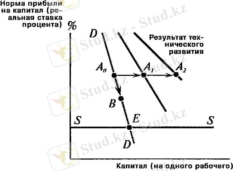 капитал азаяды. E нүктесіндегі пайыздық мөлшерлеменің төмендеуі капиталдың әрі қарай жинақталуы дерлік мүмкін емес дегенді білдіреді, себебі SS желісі нетто-таза нетто деңгейін көрсетеді.