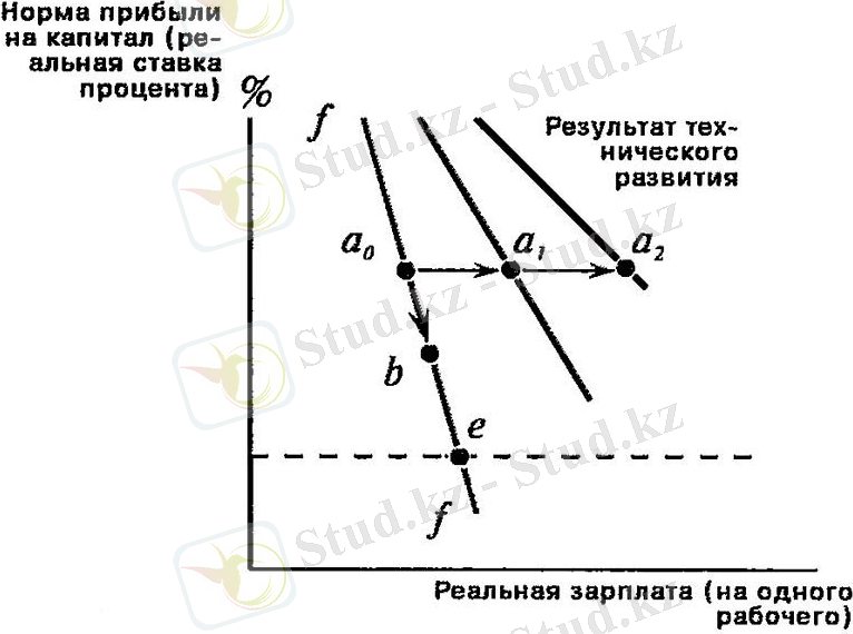 Екінші диаграммада біз капитал-еңбек коэффициенті өсіп, капиталдың өсу қарқыны көтерілгендіктен, жалақының өсу қарқыны артады (сегмент сегментінде) . Техникалық прогресс қисықтардың бірінші және екінші графиктерге ауысуына әкеледі, бұл өндірістің өсуі мен жалақының өсуін көрсетеді. Сонымен қатар, пайыздық мөлшерлеме немесе ставка