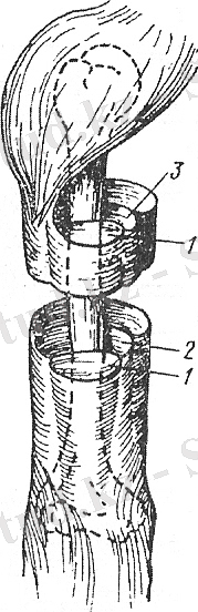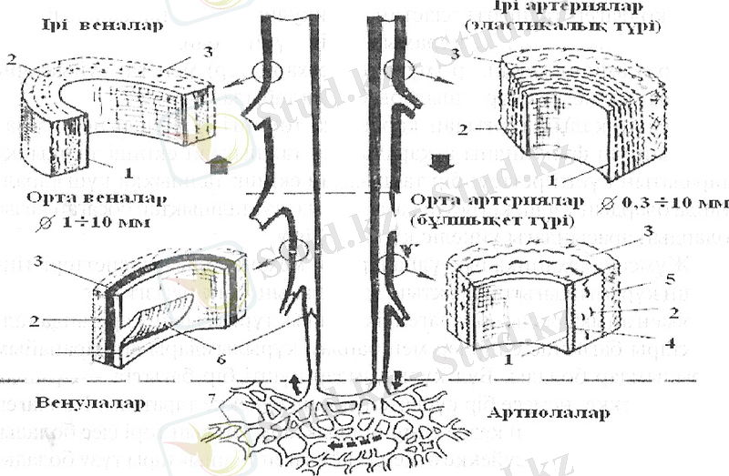 1 - ішкі кабат (интима) ; 2 - ортаңғы қабат (медия) ; 3 - сыртқы қабат