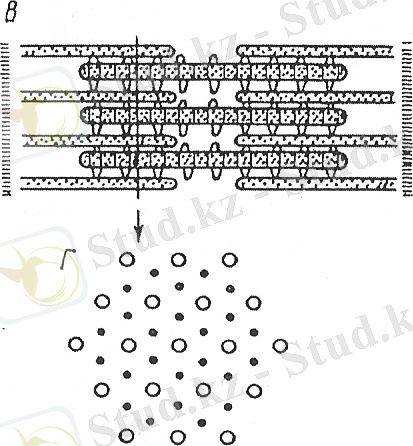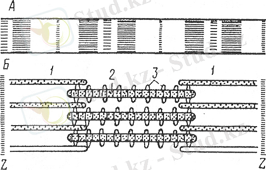 Әр миофибрилла Z-мембранамен саркомерлерінің үзындығы 2, 5- 3 мкм, бірнеше учаскелерге (телімдерге) бөЛінеді. Саркомер - қысқа-руга қабілеті бар ең кіші құрылым. Сарксзмердін. моделі 73-суретте көрсетілген. Z-мембраналардың арасында а^тинді жүкажәне миозинді қалың талшықтардан тұратын торлар орн^ласқан. Механохимиялық реакция тудыратын миофибрилді зат түск^ннен кейін (Са ++ иондар) талшықтар жиырыла бастайды.