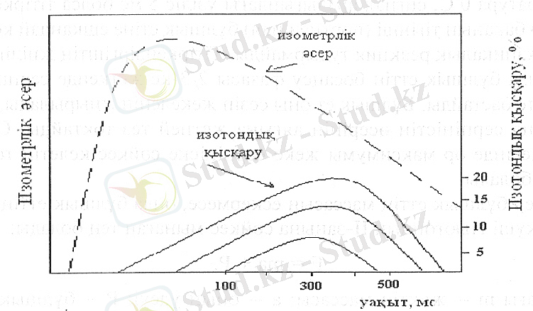 Бұлшық еттің үзындығын өзгермейді деп санап, оған әсер етсе, онда оның жиырылу күші артады, ал оған тұрақты жүктемемен (күш-пен) әсер етсе - қысқарады. Сондықтан бұлшық еттердің үзындығы езгермейтін болса, онда оларды изометрлікцеп, ал тұрақты жүкпен әсер еткенде бұлшық еттердің қысқаруын изотондық деп атайды (74-сурет) . Изометрлік әсер өте тез болады да өзінін. максималды 170 мс уақытта жетеді де, 200 мс-тен бастап сондай жылдамдықпен баяулайды.