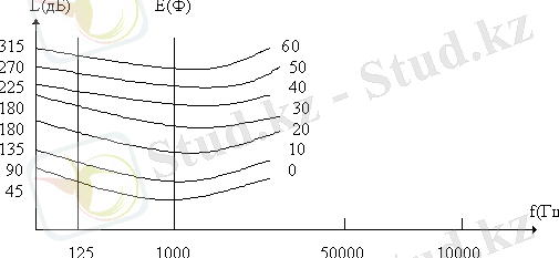 4-суретте көрсетiлген сызықтар есiтуi қабiлетi қалыпты адамдарды зерттеу нәтижелерiнiң орташа мәндерi бойынша салынған әр-түрлi жиiлiктегi дыбыстың қаттылығымен интенсивтiлiгiнiң арасындағы байланысты көрсетедi. Ең төменгi қисық өте жай естiлетiн дыбыс интенсивтiлiгiне сәйкес келедi және оны есiту табалдырығы деп атайды. Бұл қисық барлық жиiлiктерi үшiн Е Ф =0, ал 1 кГц үшiн J 0 =10 -12 Вт/м 2 мәндерiне дәл келедi. Ең жоғарғы қисық ауырсыну табалдырығына тура келедi. Кез-келген аралық қисық қатаңдығы бiрдей әр-түлi жиiлiктегi соған сәйкес келетiн дыбыс интенсивтiлiгiн көрсетедi. Қажеттi қисық арқылы сол жиiлiктегi қатаңдығың сезiнуге болатын дыбыс интенсивтiлiгiн анықтауға болады. Мысалы: дыбыс жиiлiгi 125 Гц интесивтiлiгi 135 дБ болса, осыған сәйкес келетiн дыбыс қатаңдығы қандай болады? 4-суреттен 125 Гц-мен 135 дБ-ның қиылысқан жерiнен дыбыс қатаңдылық деңгейi 10 фон екендiгiн анықтауға болады.