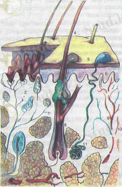 Терінің құрылысы: 1 - жанасқы денешік, 2 - жүйкенің бос ұшы, 3 - тақташалы денешік, 4 - Tepi түгі, 5 - терінің үстінгі қабаты, эпидермис, 6 - нағыз тepi қабаты, 7 - май безі, 8 - түк ұясы, 9 - терідегі тамырлар, 10 - дәнекер ұлпасы, 11 - тер безі, 12 - шелдегі май ұлпасы