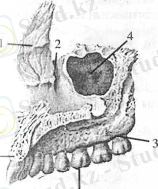 Жоғарғы жақ (верхняя челюсть, maxilla) . Жоғарғы жақтың денесі және төрт өсіндісі бар (20-сурет) . Денесі төрт беттен тұрады. Олар: алдыңғы, артқы немесе самай асты, көз шарасына, мұрынға қараған беттері. Жоғарғы жақтың алдыңғы бетінде көз шарасының гесігі және оның тіс ойығы бар. Самай асты бетінде жоғарғы жақтың денесі білінеді. Мұрын бетінде гаймар қуысының жолы, маңдай, тандай, бет (шықшыт) .