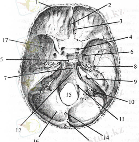 21-сурет. Ми сауытының негізі (ішкі беті) . 1. Алдыңғы ми шұңқыры. 2. Әтеш айдаршығы. 3. Тор табақша. 4. Көру тесігі. 5. Түрік ершігі. 6. Домалақ тесік. 7. Түрік ершігінің арқасы. 8. Сопақ тесік. 9. Ішкі есту тесігі. 10. Мойынтұрық тесігі. 11. Тіл асты жүйкесінің тесігі. 12. Ылди. 13. Ішкі шүйде шоқысы. 14. Ішкі шүйде қыры. 15. Үлкен шүйде тесігі. 16. Артқы ми шұңқыры. 17. Ортадағы ми шұңқыры.