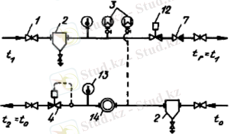 1 - қақпақ клапаны; 2 - сорғыш; 3 - манометрлер; 4 - қысым реттегіші; 7 - клапанды тексеру; 12 - басқару клапаны; 13 - термометр; 14 жылу өлшеуіші