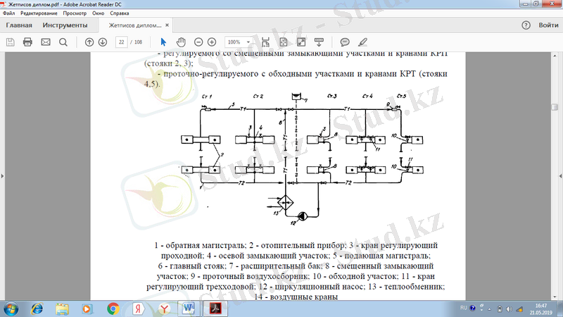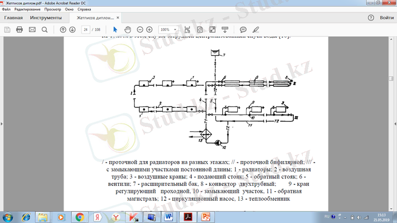 ыш; 5 - кері бағдаршам; 6 - клапандар; 7 - кеңейту цистернасы, 8 - екі құбырлы конвектор; 9 - клапанды реттейтін өту, 10 - жабу бөлімі, 11 - қайтару сызығы; 12 - айналым сорғы, 13 - жылу алмастырғыш.
