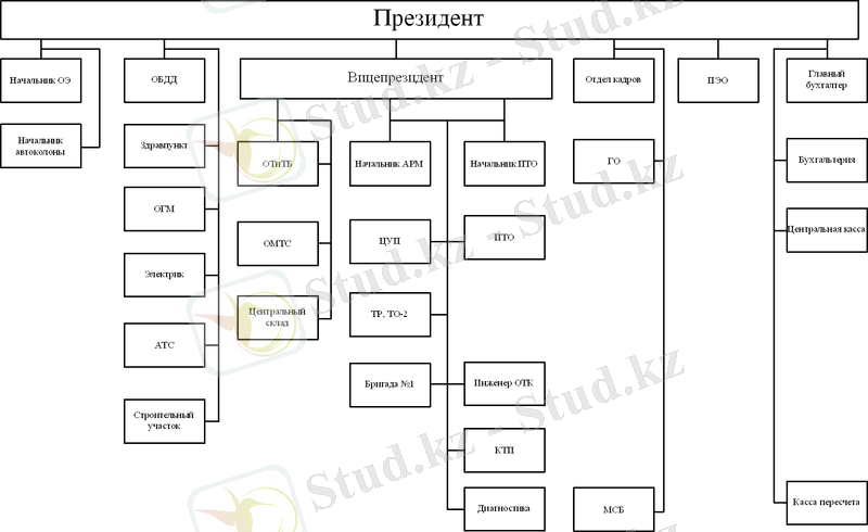 Кәсіпорынның басшысы - президент болып табылады. Президентке үлкен құқық берілген. Ол бұйрықтар шығара алады. Онда кәсіпорының жұмыс істеу тәртібі мен ережелері көрсетілген. Президент өз жұмысында кәсіпорынның ұйымдастыру құрылымына сүйене отырып барлық қазіргі және болашақ жоспарын орындайды.