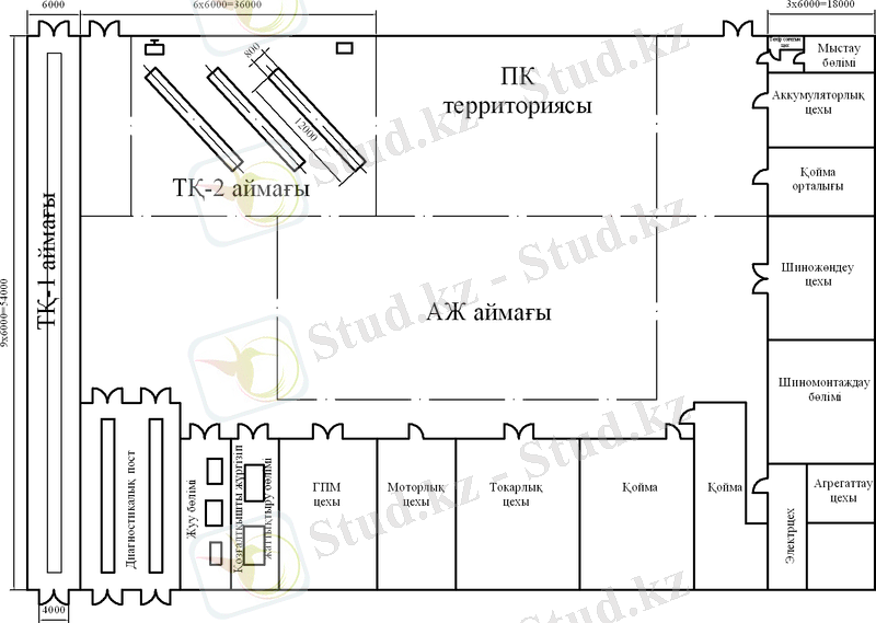 1- өндірістік, ТҚ-1, ТҚ-2 және жөндеу жұмыстарын атқаруға арналған аймақ; 2- автобустарды жуу станциясы; 3, 4- ашық тұрақ алаңы; 5- Жанар-май станциясы; 6- администрация ғимараты; 7- бақлау бөлімі (КТП) ; 8- Жылыту аймағы (котельная) ; 9- асхана; 10- сауна; 11- элекростанция; 12- жұмысшылардың және жүргізушілердің демалыс орны