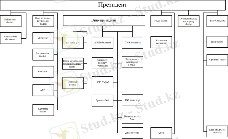 Кәсіпорынның басшысы - президент болып табылады. Президентке үлкен құқық берілген. Ол бұйрықтар шығара алады. Онда кәсіпорының жұмыс істеу тәртібі мен ережелері көрсетілген. Президент өз жұмысында кәсіпорынның ұйымдастыру құрылымына сүйене отырып барлық қазіргі және болашақ жоспарын орындайды.