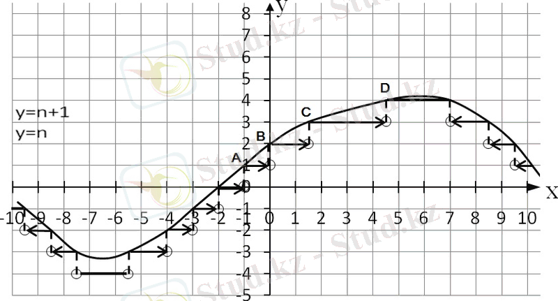 - y=n, y=n+1y = n, \ y = n + 1түзулерініңy=f(x) y = f(x) функциясының графигімен жүргізілген қиылысу нүктелерін белгілейміз. Бұл нүктелерy=[f(x) ] y = \left\lbrack f(x) \right\rbrackфункциясының графигіне тиесілі, себебі олардың ординаттары бүтін сандар (олар суреттегіA, B, C, DA, \ B, \ C, \ Dнүктелері) .
