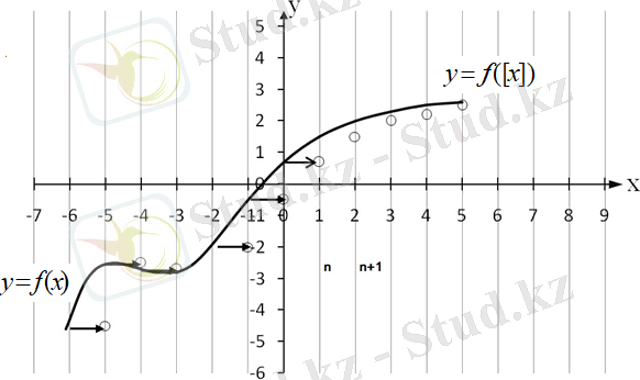 - y=ny = nжәнеy=n+1y = n + 1түзулері арқылы пайда болған жолақтардың бірін қарастырайық. y=f(x) y = f(x) функция нүктелеріy=f([x] ) y = f\left( \lbrack x\rbrack \right) функцияcының графигіне жатады, себебі олардың абсциссалары-бүтін сандар.