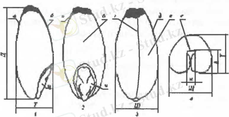 Мұндағы 1 дегеніміз - бүйір жағының көрінісі, 2 - арқа жағының көрінісі, 3 - құрсақ жағының керінісі, Д - Ұзындығы, Ш - ені, Т - қалыңдығы, а - құрсағы, б - арқасы, в - айдаршығы, г - жырашығы, д - бөшкесі, е - борозда ілгегі, ж - борозда ілгегінің ені, з - борозданың тереңдеп жатуы, и - ұрық.