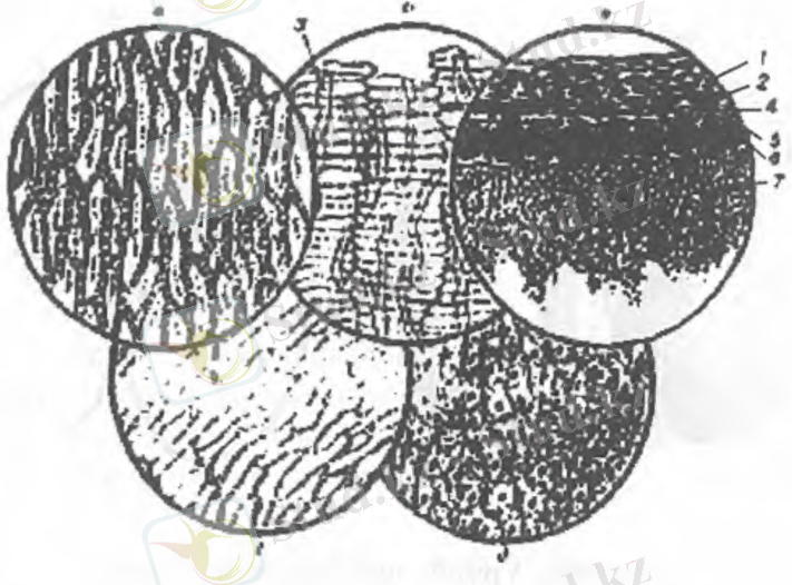 Мұндағы А дегеніміз - жемістік қабығының ұзыншақ клеткасы; б - көлденең клеткасы және жемістік қабығының құбырлы қабаты; в - дәннің көлденең кесіндісінің бөлшегі; г - тұқымдық қабықтың гиалин қабаты; д - эндоспермнің алейронды қабаты; 1 - сыртқы қабат - ұзыншақ клеткалар (эпикарпий) ; 2 - көлденең клеткалар (мезокарпий) ; 3 - құбырлы клеткалар (эндокарпий) ; 4 - пигментті қабат; 5 - гиалинді қабат; 6 - алейронды қабат; 7 - крахмалды эндосперм.