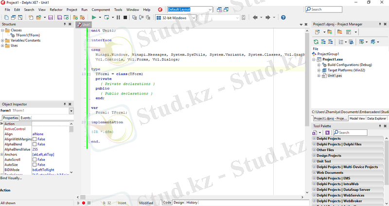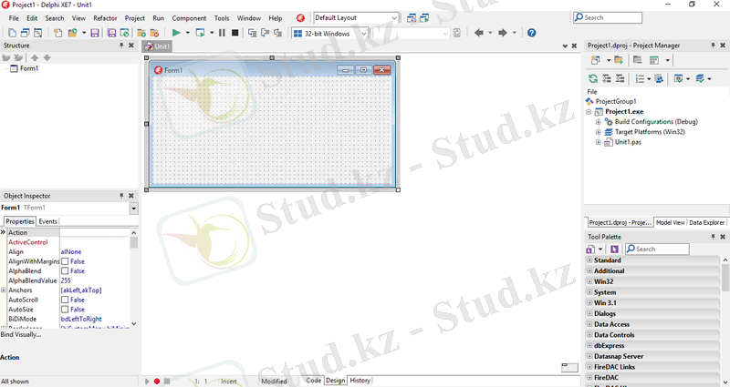 Экранда Delphi XE7 ортасының терезесі көрінеді. Келесі 1 суретте Delphi XE7 ортасы көрсетілген.