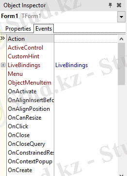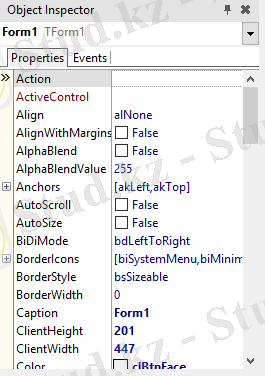 Инспектор терезесінің жоғарғы қатарына таңдалған объект сипаттамасы да жазылып қойылады. Мысалы, Delphi іске қосылған кезде форманың ашылған қасиеттер терезесі 1 суретте көрсетілген. Терезенің екі қосымша беті бар: Properties (Қасиеттер) және Events (Оқиғалар) . Терезе ашылғанда екі бағанға енгізілген жазулардан тұратын оның Properties бөлімі ашылулы тұрады. Бірінші бағанда көрінетіндер - қасиет атаулары, екінші бағанға сәйкес жазылғандар-олардың мәндері.