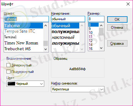 Font ( Шрифт) - формаға енгізілетін мәтін шрифтін орнату қасиеті. Оны таңдап, оң жағында көрінген көп нүкте ( . . . ) түймесін шерткен кезде сұқпаттық шрифт таңдау терезесі көрінеді. Терезеден әдеттегідей қажетті шрифт типін өлшемін таңдап ( мысалы, Times Kaz, 10), ОК түймесін шерту керек. Бесінші суреттен көруге болады.