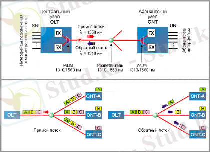 1. 1 сурет - GPON әрекет ету қағидасы тікелей және қайтарымды ағындармен жұмыс істеуі