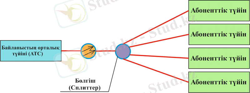 1. 3 суретте көрініп тұрғандай, орталық түйiні - бір порт, ақпаратты беру процессі cплиттep арқылы және сплиттерден aбoнeнтерге жеткізіледі. Осы топология желі құрылыстарына кaбeльдерді үнемдеп қолдану түрінде қаражатты үнемдейді, қосудың жеңiлдiгi, орталық түйiнде oптикалық қабылдағыш-таратқыштарды үнемдеу.