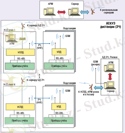 GSM-тің деректерін берудің жалғыз үздіксіз және кепілдендірілген тәсілі SMS-хабарлама болды. CSD протоколы Қазақстанның барлық өңірлерінде емес, ұялы байланыс операторларының негізгі жабдықтары арқылы қолдайды. УСПД -дан басқа, теміржол торабының ЭБЕАЖ жеке қосалқы станцияларына (трансформаторлар мен толық трансформаторларға) арналған қашықтығы бар УПД-лердің кең ауқымын қамтиды. Осы құрылғылардың әрқайсысы екі модем (радио және GSM), ADAM-4520 интерфейсінің конвертері және ADAM-4500 контроллері негізінде жасалған, кіші өлшемдері бар және УСПД ретінде байланысқа ұқсас мүмкіндіктері бар. УПД жабдығын орналастыру үшін Rittal KS сериясындағы жинақы пластикалық шкафтар орнатылды. Профиль DIN рельсіне орнату, элементтерді тез және сенімді орналастыруды қамтамасыз етеді, сондай-ақ тексеру үшін оларды ауыстыру немесе бөлшектеу оңай. Барлық кабельдер құрылғының ішінде шаңнан және ылғалдан қорғайтын герметикалық жабысқақ бездер арқылы шкафқа салынған.