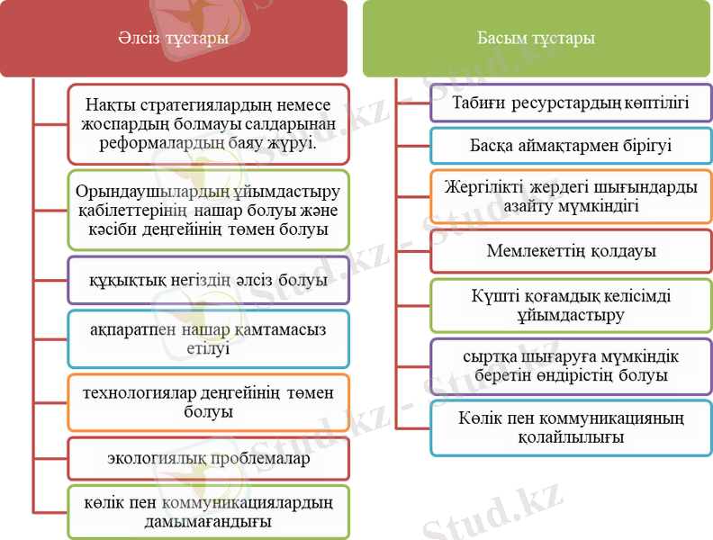 Стратегиялық жоспардың жүзеге асуы барысында стратегияны жүзеге асыру барысында әлсіз және басым тұстары маңызды рөл атқарады. 2 суретте стратегияны жүзеге асыру барысындағы әлсіз және басым тұстары көрсетілген.