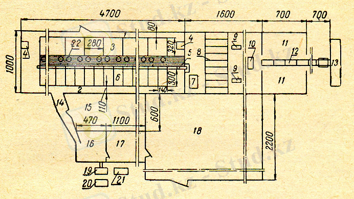 1 және 2-жүретін жол; 3-қырқылмаған қойларға арналған қора; 4-қайрау аппараттары; 5-жүн тасымалдағыштар; 6-қырқылған қойлар қорсаы; 7-сортаң столы; 8-сортталған жүн сақтайтын орын; 9-пресстер; 10-торозилер; 11-жүн тайлау орны; 12-көлбеу тасымалдағыш; 13-жүн тиеуге арналған орын; 15-затоп; 16-шомылдыру зонасы; 17-шомылғанна кейін қой тұратын орын; 18-шомылған қойларды қамау орны; 19-отейник; 20-дистерка; 21-пайдаланылған ерітіндіге арналған ыдыс; 22-қырқымшылардың жұмыс орны.