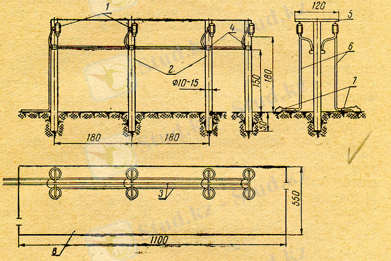 1-қозғағыш ПАД-0, 12Б; 2-бағана; 3-электр кабелі; 4-қосқыш; 5-қозғағышты бекіту тірегі; 6-иелмелі білік; 7-қырқу машинкалары; 8-биіктігі-2, 2 м желден қорғау үшін арналған шарбақ.
