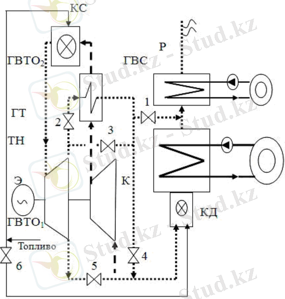Жылуалмастырғыштары: ГВТО1, 2-газ -су жылуалмастырғыштар; ГВС-ыстық сумен жабдықтау; ТН- жылыту жүктемесі, 1-5-газ тарату жүйесінің шиберлері. К-компрессор; КС-жану камерасы; ГТ-газ турбинасы; КУ -қазан-кәдеге Жаратушы; Д-деаэратор; ПН- қоректендіргіш сорғы; КН-конденсатты сорғы; Э-электрогенератор