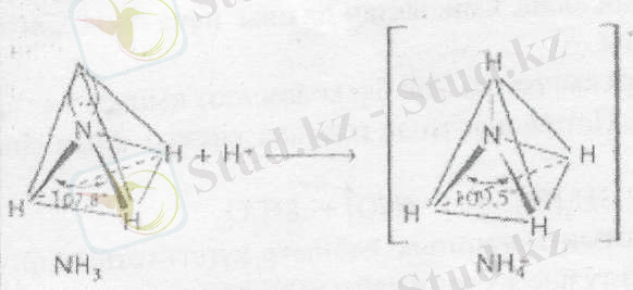 Аммиактың молекуласы үшбұрышты пирамида пішінді, ішкі жағында азот атомы, ал төрт бұрышында - үш атом сутегі және бip электронды жұп орналасқан. Аммиак молекуласындағы H-N-H бұрышы (107, 8°) тетраэдрге жакын. Cyтeгi ионы Н + қосылғанда, ол аммоний катионына NH 4 + айналады да пішіні дұрыс тетраэдрга келеді.
