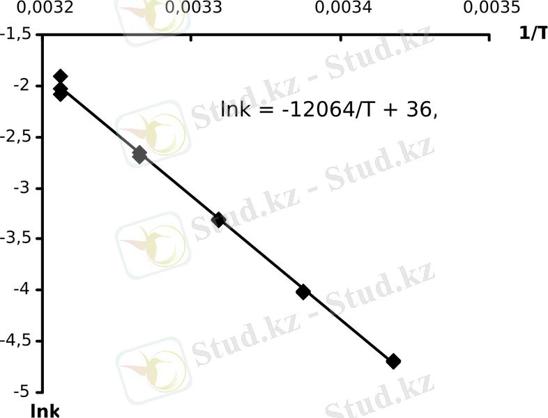 Бұл рекцияның кинетикасы түрлі температуралар кезінде 1, 45 моль/л концентрациялы күкірт қышқылы қатысында зерттелді. Эксперименттік мәліметтер бойынша ln k - 1/T тәуелділік графигі тұрғызылады. Аррениус теңдеуінен шығатыны - бұл сызықты тәуелділік (1 сурет) . Тура теңдеу табылып, оны Аррениустың логарифмделген теңдеуімен салыстыра отырып: