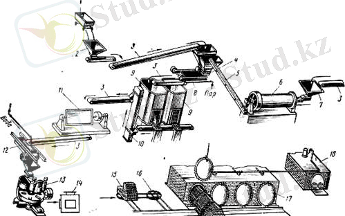 Силосты әдіспен шикізатты араласпаны дайындау мен силикатты кірпішті өндіру: 1 - құм жеткізуші вагонетка, 2 - құмға арналған бункер, 3 - ленталы транспортерлер, 4 - дозаторы бар ұнталған әкке арналған бункер, 5 - әк жеткізуші шнек, 6 - шарлы диірмен, 7 - әкті ұнтауға арналған бункер, 8 - смеситель, 9 - силостар, 10 - элеватор, 11, 12 - араластырғыштар, 13 - пресс, 14 - автомат-укладчик, 15 - шикізаты бар вагонетка, 16 - бұрғыш круг, 17 - автоклавтар, 18 - булы камера.