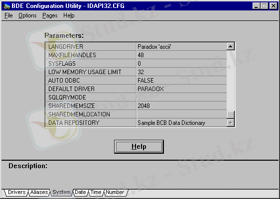 Жүйелік орнатпалар беті 1. 10-суретіне сәйкес BDE қолданатын және Windows реестрінде сақталатын жүйелер мен желілер параметрлерді орнатуға мүмкіндік береді [7] .
