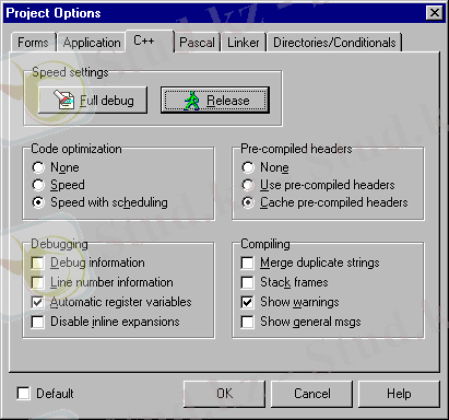 Егер де жобада Delphi-дің модульдері мен формалары қолданылса, Debugging секциясындағы барлық опцияларды өшіріп Pascal. Бетіндегі Code Generation секциясындағы Optimization опциясын қосу керек. [8]