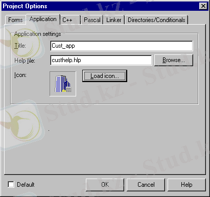 Осы диалогтық панелде қосымшаның пиктограммасын таңдау қажет. Оны С++ Builder қосымшасына кіретін графикалық редактордың көмегімен құруға болады. Оны менюден Tools/image Editor пунктін таңдау арқылы компиляцияға жіберуге болады. Одан басқа, 1. 12-суретіне сәйкес қосымшаның атын нұсқау қажет және де контектілі-тәуелді көмектің экранынан тұратын справка файлының атын нұсқау қажет.