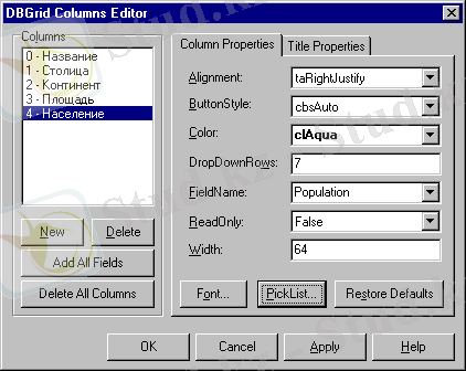 1. 4-сурет. Columns Editor комегімен DBGrid бағандарының қасиеттерін орнату