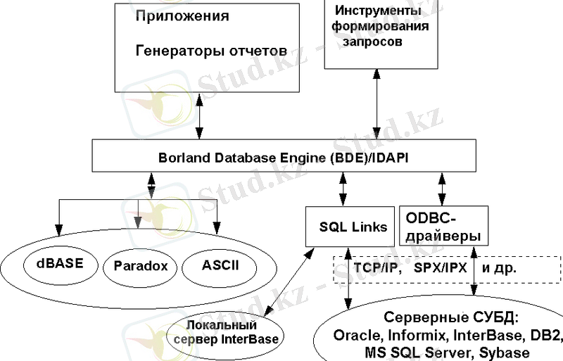 - Borland SQL Links драйверінің көмегімен SQL-серверіне (Oracle, Sybase, MS SQL Server, InterBase, Informix, DB2) жолашықтықты көрсетеді