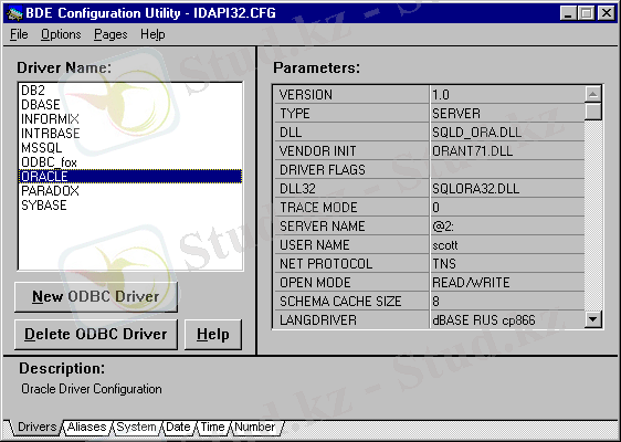 Деректер қорының драйверлерін орнату үшін 1. 7-суретіне сәйкес Деректер қорының драйверлерін орнату BDE орнатпасының Drivers утилитасының беті қолданылады. Бұл беттің сол жақ бөлігінде BDE драйверлері үшін қолайлы тізім бар., оның ішіне dBase и Paradox үшін драйверлер, берілген компьютерге орнатылған СУБД серверіне жолашықтық үшін SQL Links драйверлері кіреді, сонымен қатар Windows басқару панелінің ODBC-ның 32-разрядтық администраторының көмегімен құрылған ODBC-мәліметтер көзінің аты кіреді.