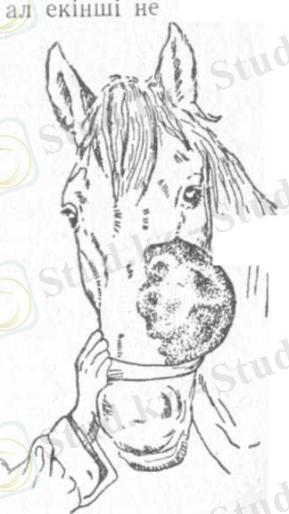 Е м д е у. Сынған жерді хирургиялык жалпы тәсіл бойынша (жа-ракаттан караңыз) тазалайды, жарыншак сүйектері мен бөгде зат-тарды алып тастап, сүйектің ұштарын бір-5іріне жакындастырады, егер мүмкіндігі болса, сынған сүйекті металдан жасалған скобамен тігіп, сынған жерді сыммен нығайтады, не 180-суретте кәрсетілген шина колданады. Жылкыға кебектен, ұсакталған овошьтан, сүттен және жұмырткадан жасалған боткаларды мұрыны аркылы өнешіне енгізетін түтік аркылы күніне 4-5 кайтара, 2, 5-3 жеті шамасы беріп отырады. Сонымен катар ұсак тураған шөпті бөрттіріп (кол-дан) береді. Жемдегеннен кейін ауызыныц ішін калий пермагана-тының (марганец кышкылды калийдін) әлсіз ертіндісімен жуады. Астыңғы жағының екі сабағы бірдей сынған жылкыныц жазылып кетуі әзірше бірен-саран ғана (Оливков пен Скоробоготовтың жұ-мыстары) . Қыйғыш сүйек 2-3 күрек тісімен бірге сынып, жак са-бактарының бірігіп біткен жерінен ауысып кетпесе кауыпты сокпай-ды. Дұрыс емдеген жағдайда, мұндай жаракаттанудан кызмегке кабілеттілік касиетін жоймайды, ез коңын сактайды.