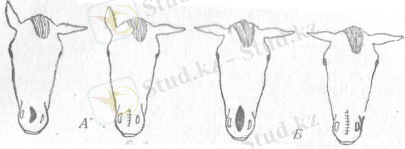 Б а р ы с ы. Бастыц терісі мем мускулдарының аз козғалатынды-ғынан жоне каннын жаксы бастағы жаралар көбінесе тез жазылады, дегеимен аурудын барысы жаракаттанудын түріне байланысты болады. Бәрінен де кесілген жаралардың барысы колайлы өтеді, олар көбінесе бірінші өбісу жолымен жазылады, бірак бет нервісі кесілген кезде онын паралич болыи калуы мүмкін. Тесілген жаралар инфекцияланады, сондыктан олар-дын барысы колайсыздау өтеді. Егер сүйек ткані бұзылса, соғыл-ған және ок тиген жаралар да баяу жазылады. Мый жаракаттанған кезде аурудын барысы колайсыз өтеді, ондай жануарларды сояды не етке жарамаса елтіріп, көміп тастайды.