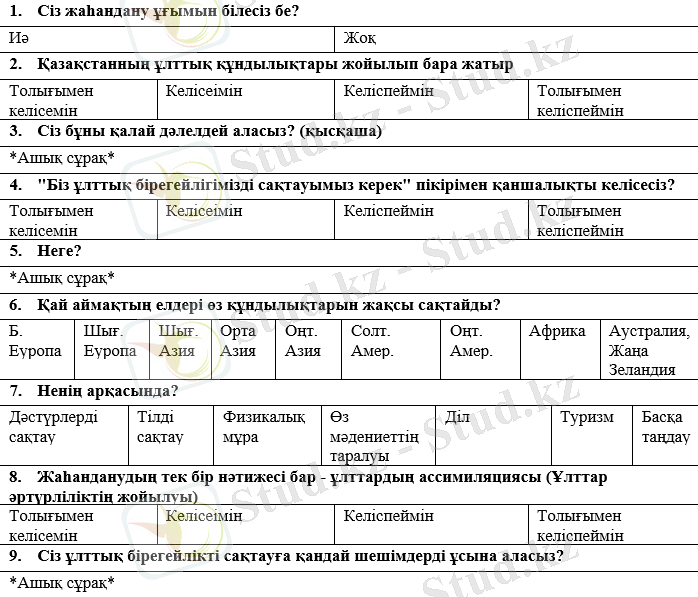 Зерттеу жұмысының тәжірибелік бөлімінде сауалнама сұрақтары құрастырылып, басты зерттеу әдісі ретінде сауалнама алынды. Тақырыпқа байланысты статистика аздығына байланысты, осы әдістерге негізделе отырып, оларды анықтау қолға алынды. Зерттеу жұмысының тақырыбы жалпы Қазақстан Республикасының тұрғындарына байланысты болғандықтан, сауалнама ғаламтор желісінде жүргізілді. Мақсатты аудитория - кез келген Қазақстан азаматы, сол себебі сұрақтар екі тілде құрастырылған, нақты айтқанда қазақ және орыс тілдері, және барлығына түсінікті тілде берілген. Мәселен, жаһандануға қатысты терминдердің анықтамасы немесе кейбір түсіндірмелер берілген болатын. Көзделген аудитория - 10 жастан асқан азаматтар, өйткені осы жастан бастап көзқарас қалыптасады, одан бөлек - қазіргі заманда жаһандану үдерісі әсіресе жастарға ғаламтор арқылы айтарлықтай әсер етеді, сондықтан егер сауалнамаға жауап беруші “жаһандану” деген терминді білмесе де, оған үрдістің жалпы түсінігі белгілі деп айтуға болады. Негізінен, сауалнама 10 сұрақтан кұрастырылған, олар әр түрлі нұсқада құрастырылған: кейбірі ашық жауапты, кейбірінде бір нұсқаны таңдауға немесе бірнеше нұсқаны бірден таңдауға болады. Берілген кестеде сауалнама сұрақтары мен жауатардың нұсқалары ұсынған.