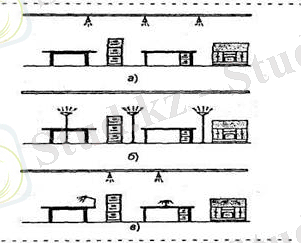 а - біржақты жанынан жарықтандыру; б - екі жақты жанынан жарықтандыру; в - үстеме жарықтандыру;