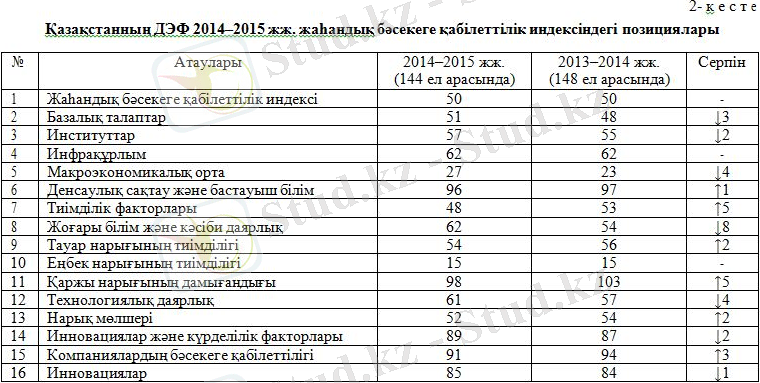 Қазақстанның бəсекеге қабілеттілігі орташа деңгейде, яғни, институттар қазіргі таңда 2014 ж. - 57, (2013 ж. - 55), инфрақұрлым 2014 ж. - 62 (2013 ж. - 62), жоғары білім жəне кəсіби даярлық 2014 ж. - 62 (2013 ж. - 54), тауарлар нарығының тиімділігі 2014 ж. - 54 (2013 ж. - 56), технологиялық даярлық 2014 ж. - 61 (2013 ж. - 57) жəне нарық мөлшері 2014 ж. - 52 (2013 ж. - 54) .