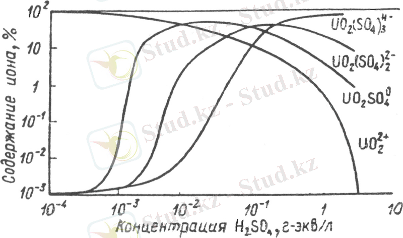 Сульфат ерітінділері құрамындағы уранның қарапайым кешендік иондарының қатынасы ерітіндінің артық қышқылдылығына, құрамындағы сульфат - иондардың мөлшеріне және уранның концентрациясына байланысты өзгереді (1. 1 - суреті) . Арасында динамикалық тепе-теңдіктің болуы оны аниониттер немесе катиониттер түрінде шығаруға мүмкіндік береді, ол үшін тепе-теңдікті сорбцияланатын ион жағына жылжытса болғаны. Ерітіндінің pН деңгейі 2, 5 жоғары көтерілгенде уранил иондарының полимеризациясы байқалады, нәтижесінде кешендік уранил - сульфаттық ион U2O5(SO4) 3 түрінде құрылып, аниониттердің көлемі едәуір жоғарылайды.