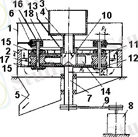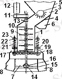 Клиноремен беру арқылы электр қозғалтқыштан айналуға әкелетін тік біліктегі корпус осі бойынша жоғарғы және төменгі дискілер, тиеу тесіктері, екпінді арналары бар ротор орнатылған. Ротордың жоғарғы және төменгі дискілерінде бекітілген подшипник тіректеріндегі ротордың перифериясында тік осьтер орнатылған. РНР - 1 және РНР-1 және РНР-1 және РНР-1 және РНР-1 және РНР-1 және РНР-1 және РНР-1 және РНР-1 және РНР-1 және РНР-1. Ролик-сателлиттер цилиндрлік ернеудің ішкі беті бар фрикциялық іліністе болады.