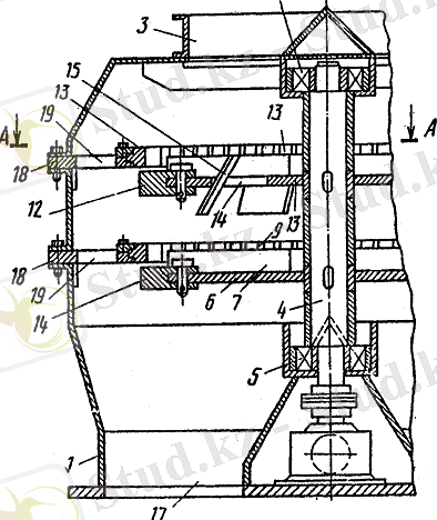 Бастапқы материалды беру келтеқұбыры бар қақпақ орнатылған цилиндрлік корпустың ішінде мойынтіректерде бекітілген және айналу жетегі бар тік білік орналасқан (схемалық түрде көрсетілген) .