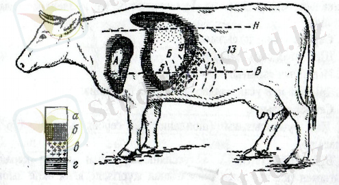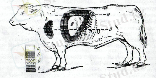 Сурет 8 - Өкпенің перкуссиялық шекаралары (сиырда) :Н - мықын сызығы; В- иық буын сызығы; А - жауырын алдындағы перкуссиялық аймағы; Б - көкірек қуысының перкуссиялық аймағы