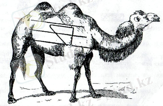 Сурет 11 - Түйенің өкпесінің перкуссиялық шекаралары (Семушкин Н. Р. бойынша) : А - құйымшақ төмпешігінің төмен жағынан 12 қабырғаға дейінгі сызық; В- шонданайдың төменгі жағынан 10 қабырғаға дейінгі сызық; В-иық буын сызығы (8 қабырғаға дейін)
