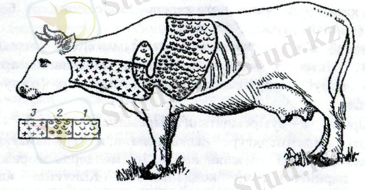 Сурет 14 - Ірі қара малдың демалуындағы тыныс шуылдарының орналасуы:1- таза везикулярлық шуыл; 2 - везикулярлық; 3 - кеңірдектен өткізілген шулар