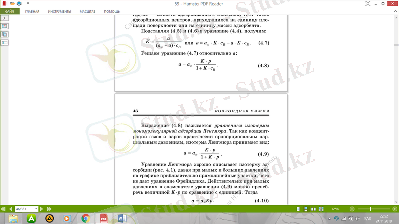 Газ концентрациясының (қысымының) артуымен тепе-теңдік адсорбциялық кешеннің қалыптасуына ауысады, ал еркін белсенді орталықтар кішірек болады.